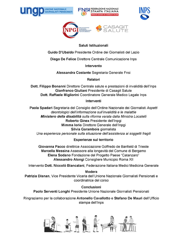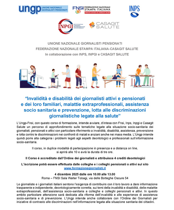 L’Ungp-Fnsi, con questo corso di formazione, intende avviare, d’intesa con Fnsi, Inps, Inpgi e Casagit Salute un percorso di approfondimento sulle tematiche legate alla situazione socio-sanitaria dei giornalisti, pensionati e attivi con particolare riferimento a invalidità, disabilità, assistenza, prevenzione e lotta contro le discriminazioni nei confronti di malati e anziani anche nei mass media. L’Ungp intende quindi porre alla categoria i problemi legati agli aspetti deontologici e professionali sull’informazione socio-sanitaria.