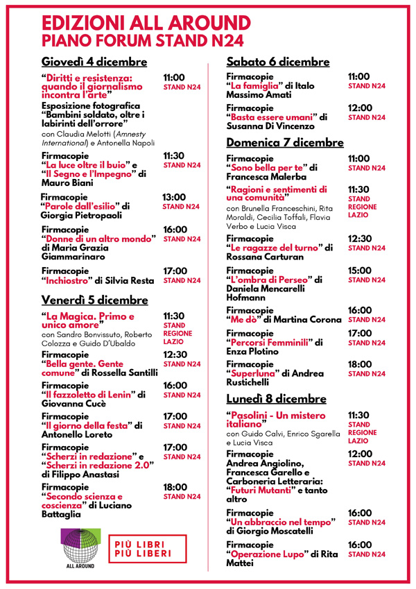 Anche quest’anno All Around sarà presente a Più Libri Più Liberi, la Fiera della piccola e media editoria che si terrà presso il Centro Congressi La Nuvola di Roma dal 4 all’8 dicembre 2025. Appuntamento con i nostri lettori e le nostre lettrici presso lo STAND N24 al PIANO FORUM. Vi aspetteremo con le ultime novità editoriali in catalogo, i firmacopie dei nostri autori e delle nostre autrici e alcuni eventi che promuovono la lettura e la cultura nello spirito cooperativo fondativo della casa editrice.