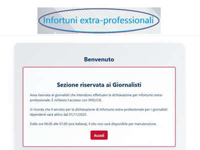 Dal 1° luglio 2026 e sino al 31 dicembre 2027, tutti i giornalisti (o loro eredi) che abbiano subito un infortunio extra professionale, nei casi previsti dal contratto Fieg-Fnsi, nel corso dell'anno 2025 (dal 01/01/2025 al 31/12/2025) potranno presentare domanda di indennizzo all’Inpgi - esclusivamente per via telematica - avvalendosi dell’apposita procedura online raggiungibile anche dall’apposita sezione del sito web della Fnsi (CLICCA E ACCEDI AL SERVIZIO).